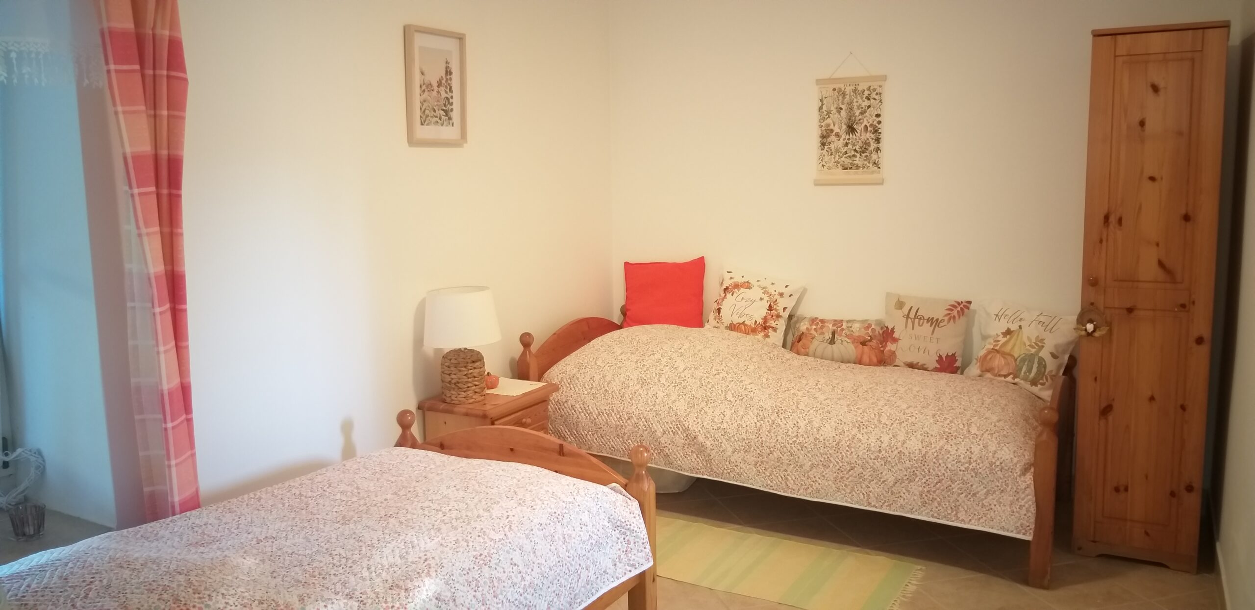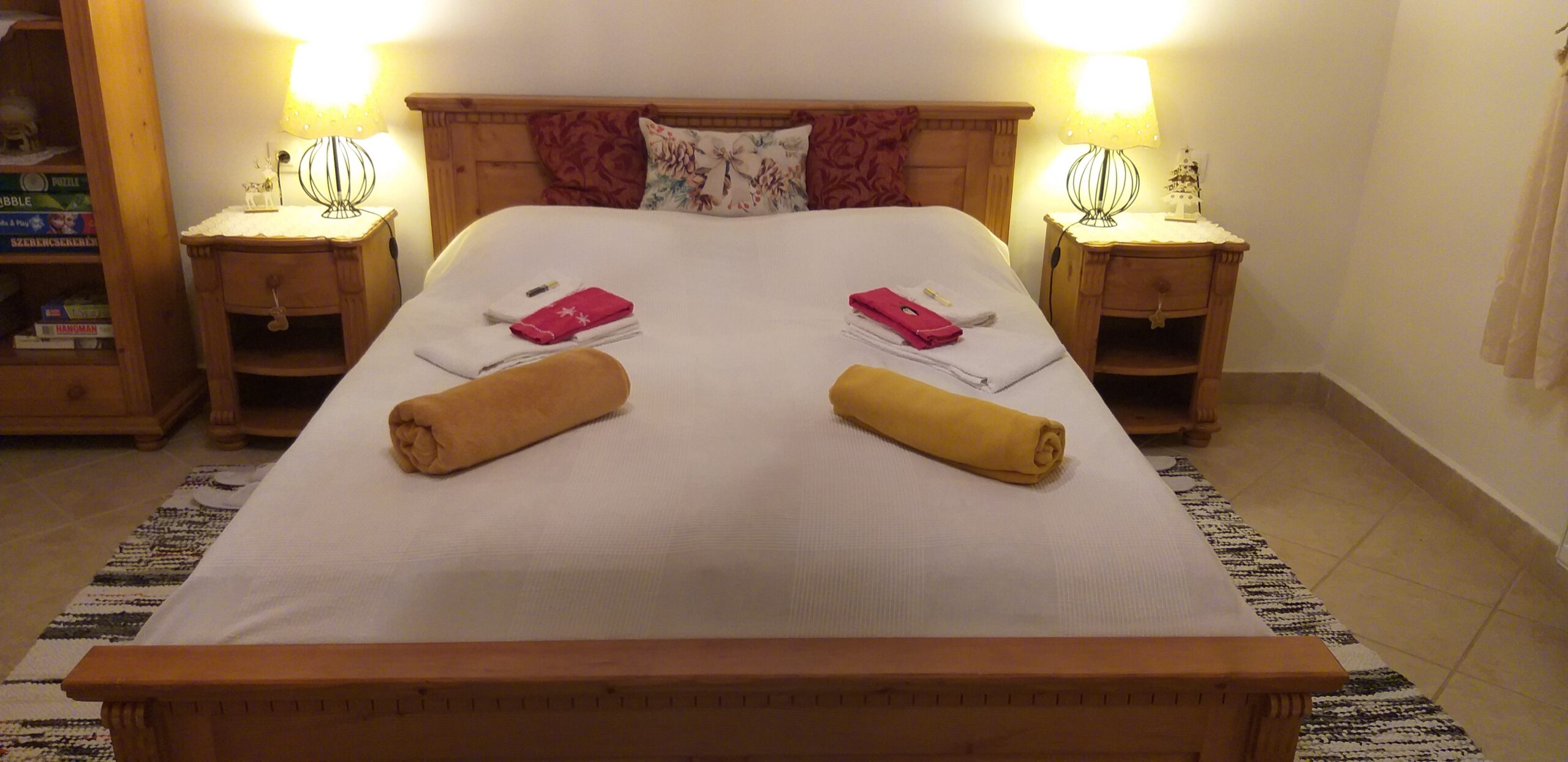 Az utcafronti hálószobánk franciaággyal, a kisebbik hálószobánk pedig két egyszemélyes ággyal rendelkezik, a nappaliban kinyitható kanapén két főnek nyújthatunk szállást.