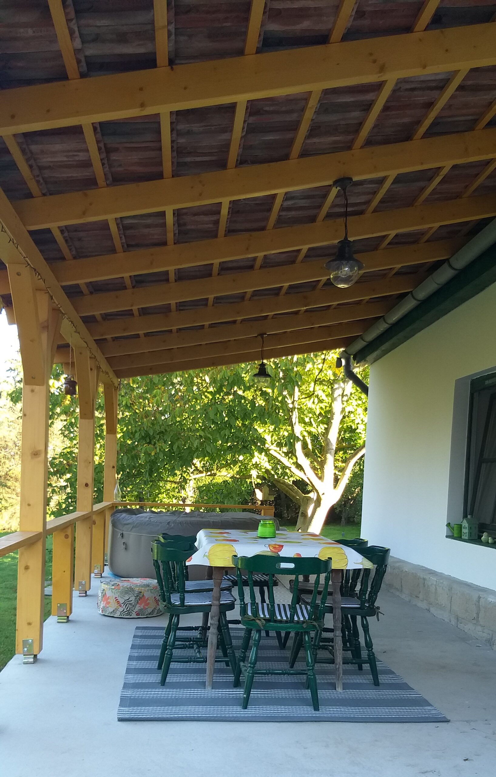 A tornácon hangulatos és stílusos ülőalkalmatosságok, a fedett teraszon jakuzzi, hat személyes asztal várja a vendégeket. A szabadtéri sütés-főzés szerelmeseinek szintén fedett részen bográcsozásra, tárcsázásra és szalonnasütésre is van lehetőség.