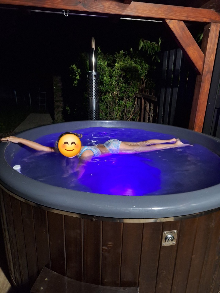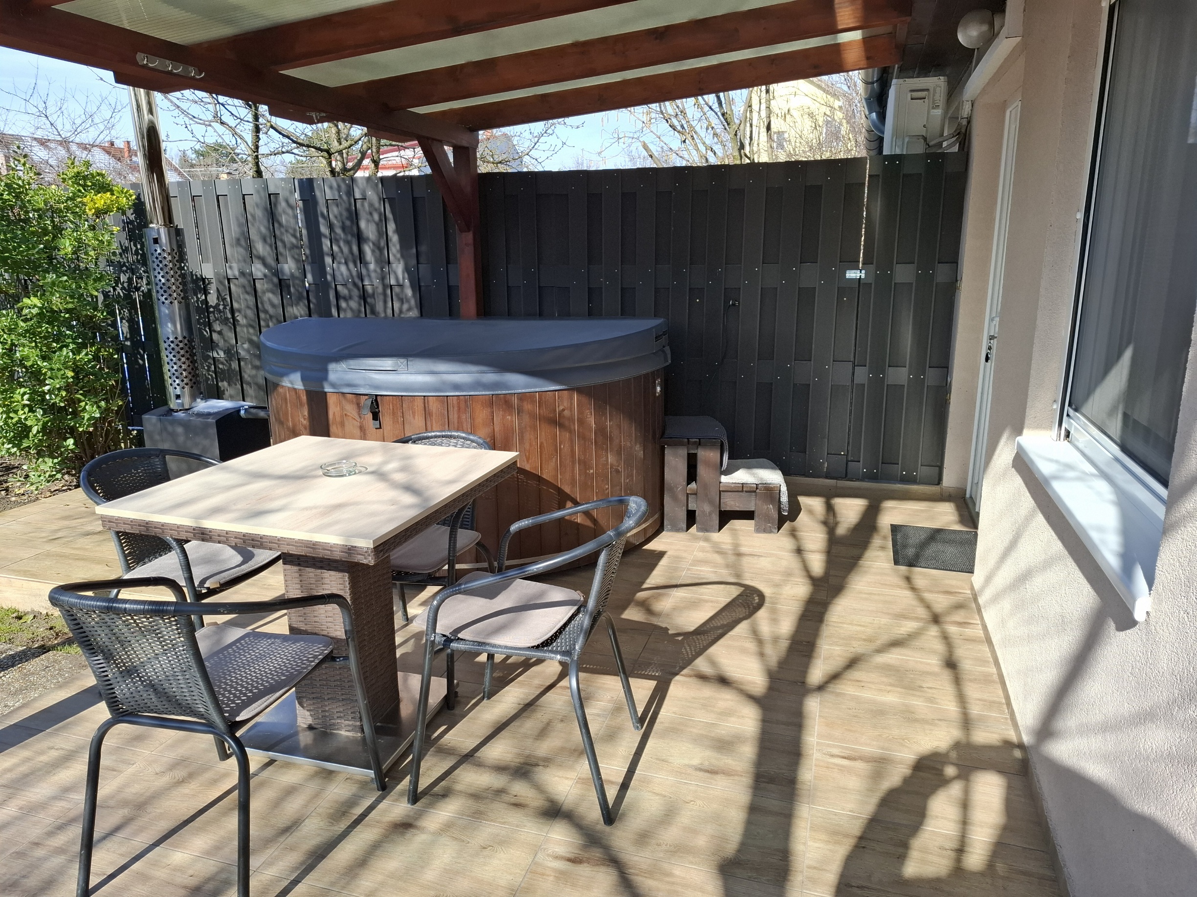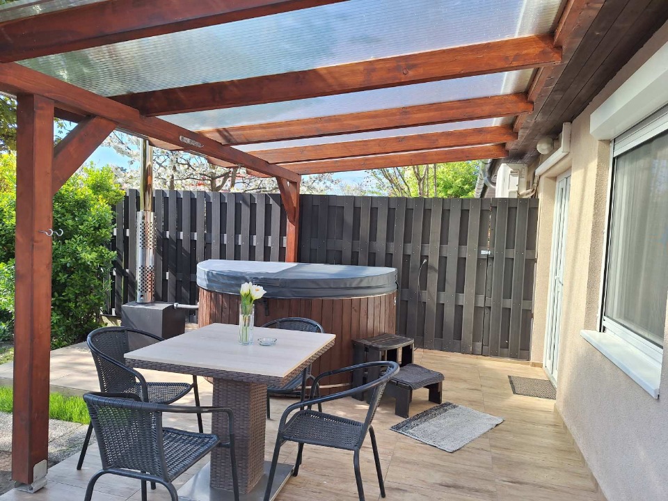 A fedett teraszon van a 6 személyes dézsafürdő, amit a víz mellett parajdi dézsasóval töltünk fel. Este kiváló hangulatot biztosít a dézsába szerelt ledfény.
