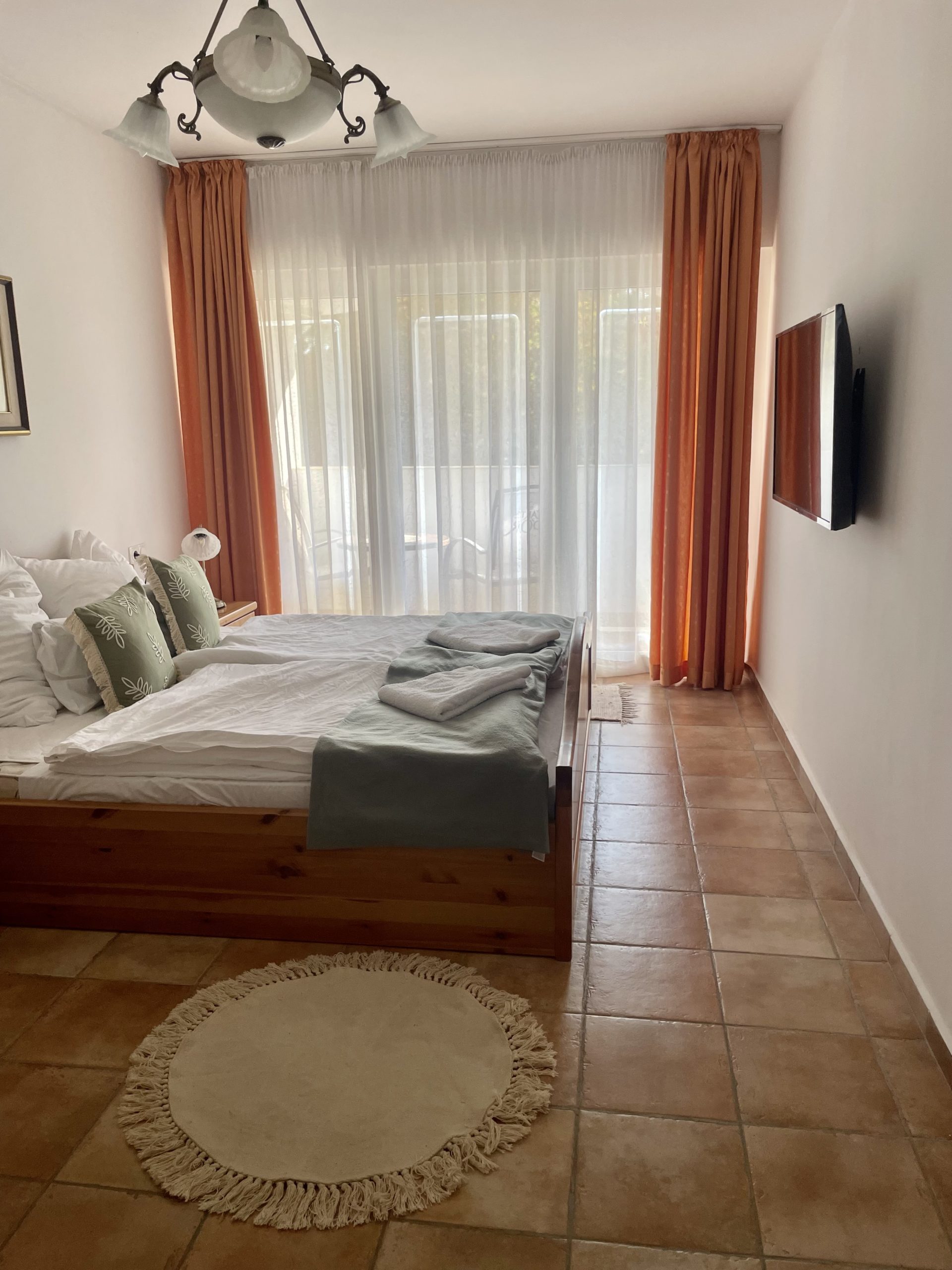 Panziónk Harkány fő utcájánák központjában épült, mediterrán stílusú épület, tágas szobákkal és teraszokkal. A Harkányi Gyógy és Strandfürdő mindössze 100m-re található a szállástól, így nagyon kényelmesen és gyorsan elérhető. Szobáink klimatizáltak(hűtő,fűtő), nagy méretű Led Tv-vel, hűtővel, ingyenes Wifivel felszereltek, valamint minden szobánkhoz jár egy parkoló kártya, amivel Harkányban bárhol ingyen lehet parkolni. Egyedi tömör fa bútorokkal berendezett, 200x180as franciaágyunk kényelmes matracokkal szerelt, nagyméretű fürdőszobáink angol wc-vel, bidével, hajszárítóval rendelkeznek. Teraszainkról csodás kilátás nyílik a közelben fekvő Tenkes hegyre, illetve a Harkányi főutca pezsgő életére. 200m-en belül több étterem, kávézó,fagyizó, cukrászda, boltok, buszmegálló, orvosi rendelő található.