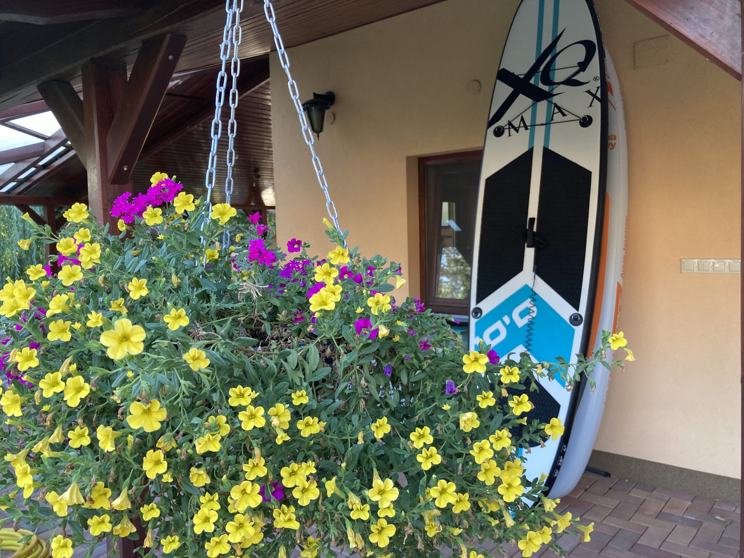 Az épülethez tartozik egy külön konyha, melyhez nyári fedett terasz kapcsolódik 10 fő részére alkalmas kerti bútorral. Amíg az időjárás engedi, ez a társasági élet fő színtere, hiszen közel a vízpart, a stég, a kerti sütögetés és főzés lehetősége. Innen belátható az udvar is, ahol a gyermekek számára kis homokozó, bébi csúszda, és nagy füves terület áll rendelkezésre. A reggeli kávézáshoz a békák hangversenye, a délutáni esti sziesztához a vadkacsák kedves üdvözlése ad aláfestést.