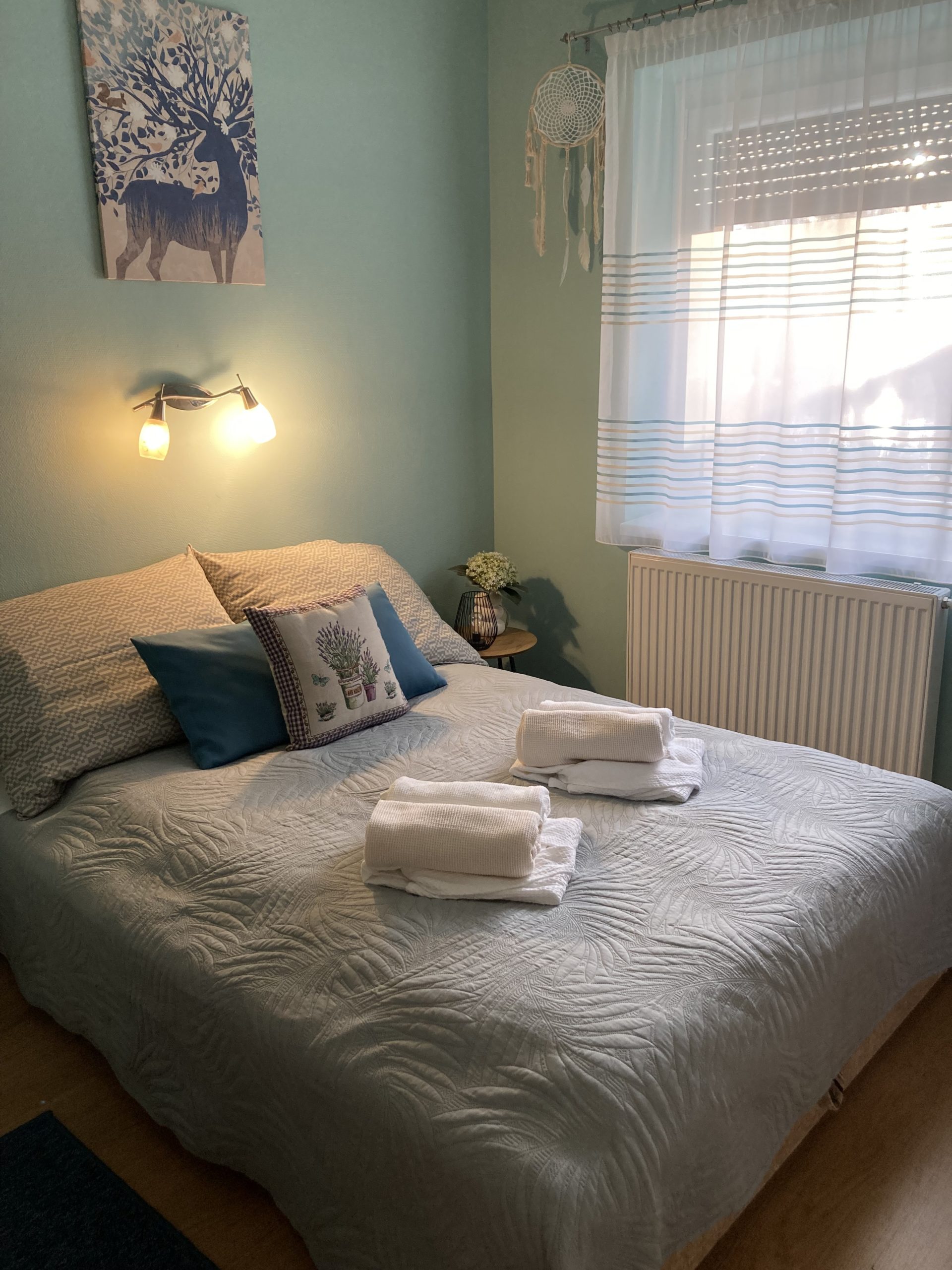 Két különálló apartmant alakítottunk ki, maximum 5-5 fő kényelmes elhelyezésére. A ház kizárólag egyben foglalható, már 2 fő esetén is biztosítjuk a kizárólagos foglalást. Maximum 10 fő részére tudunk kényelmes elhelyezést biztosítani. A 60 m2-es apartmanok külön bejárattal rendelkeznek, nem dohányzók, szúnyoghálóval, redőnnyel ellátottak, zuhanyzós fürdőszobával, hálószobával, nappalival és jól felszerelt konyhával rendelkeznek. Mindkét apartmanban a hálószobában egy 160 cm-es franciaágy, a nappaliban pedig 2 személy részére kényelmesen ágyazható nagy méretű sarokkanapé, valamint egy darab egyszemélyes kárpitozott fotelágy található. A szobák nem egymásból nyílnak. Az apartmanokban központi fűtés szolgálja a meleget a téli hónapokban és klímaberendezés gondoskodik a nyári hőség enyhítéséről. A wifi használata is ingyenes.