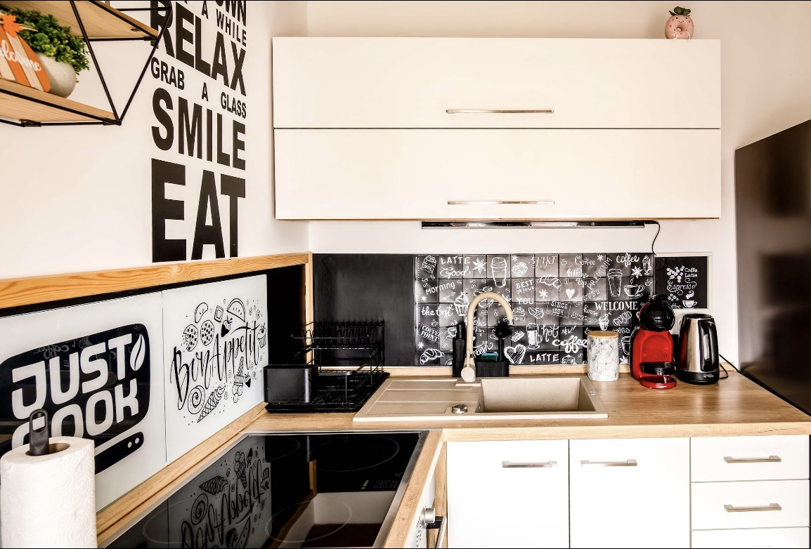 🍽️Teljesen felszerelt konyha: főzőlap, sütő, mikró, hűtő, vízforraló, kapszulás kávéfőző, edények