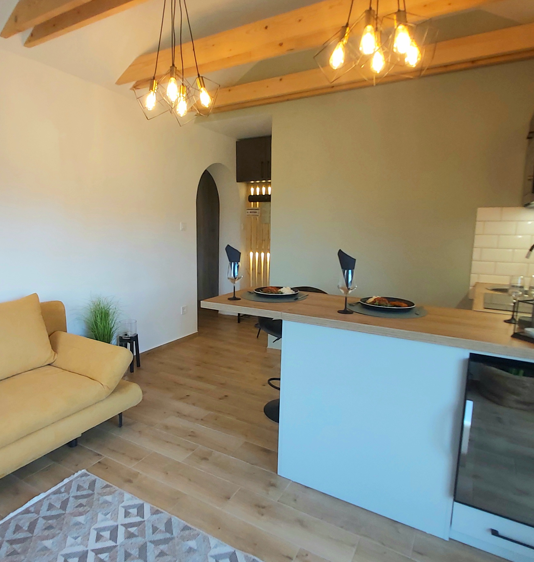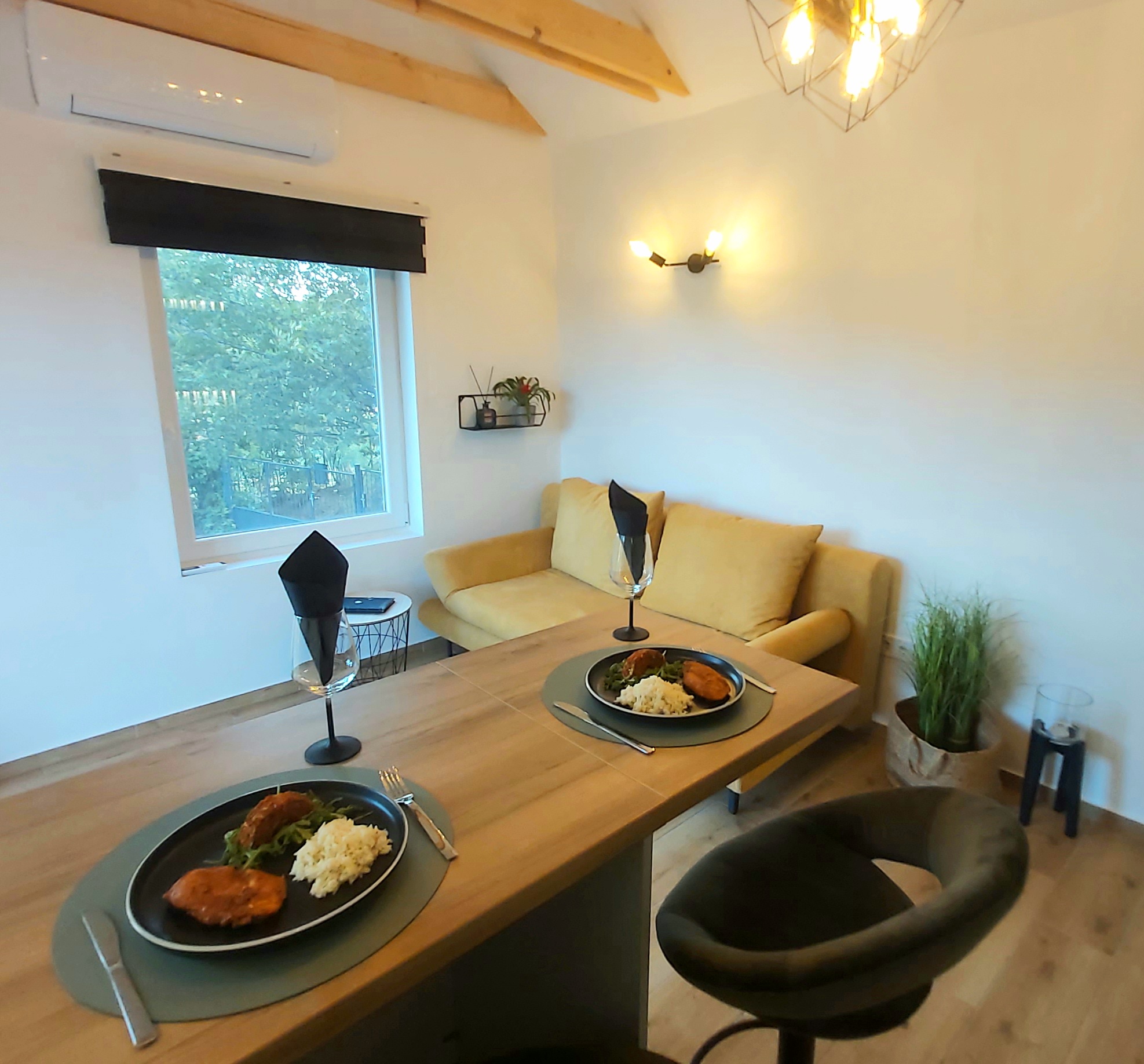 Az amerikai konyhás nappali teljesen felszerelt, a kanapé + 1 főnek pótágy funkciót szolgál.