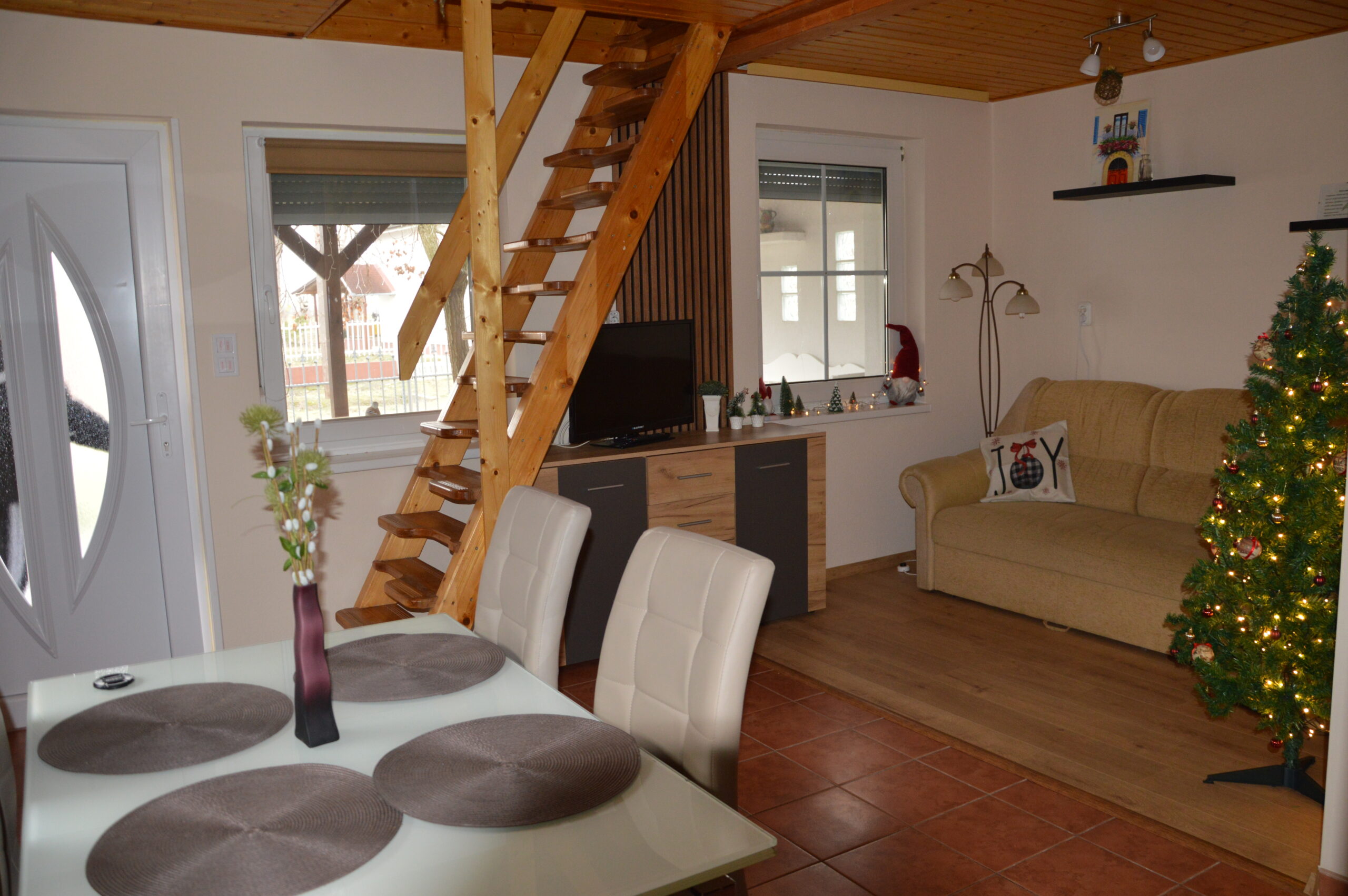 Az apartman 5 /vendég részére biztosít kényelmes elhelyezést.Az apartman foglalási ára 4fő ig 40000 ft, ifa 300ft/fő/éj plusz vendég 10000ft /éjszaka.Kiemelt időpontokon (pl. őszi szünet karácsony szilveszter) más árakat alkalmazunk.Minimum 2 éjszakára foglalható! Az alsó szinten egy ebédlő-nappali rész található, amiből 1 szoba nyílik, illetve a fürdőszoba zuhanyzóval és WC-vel. A konyha hűtőszekrénnyel,mosógéppel, főzőlappal, mikróval, kávéfőzővel és edényekkel felszerelt. Az alsó szinten lévő szobában 1 kétszemélyes francia ágy, a felső szinten egy két személyes franciaágy, egyszemélyes ágy található. A nyaraló klímával felszerelt. A ház előtt fedett, árnyékos, tágas terasz található. A kertben bográcsozásra, illetve sütögetésre is van lehetőség, a gyermekeknek egy fészekhintával kedveskedtünk.