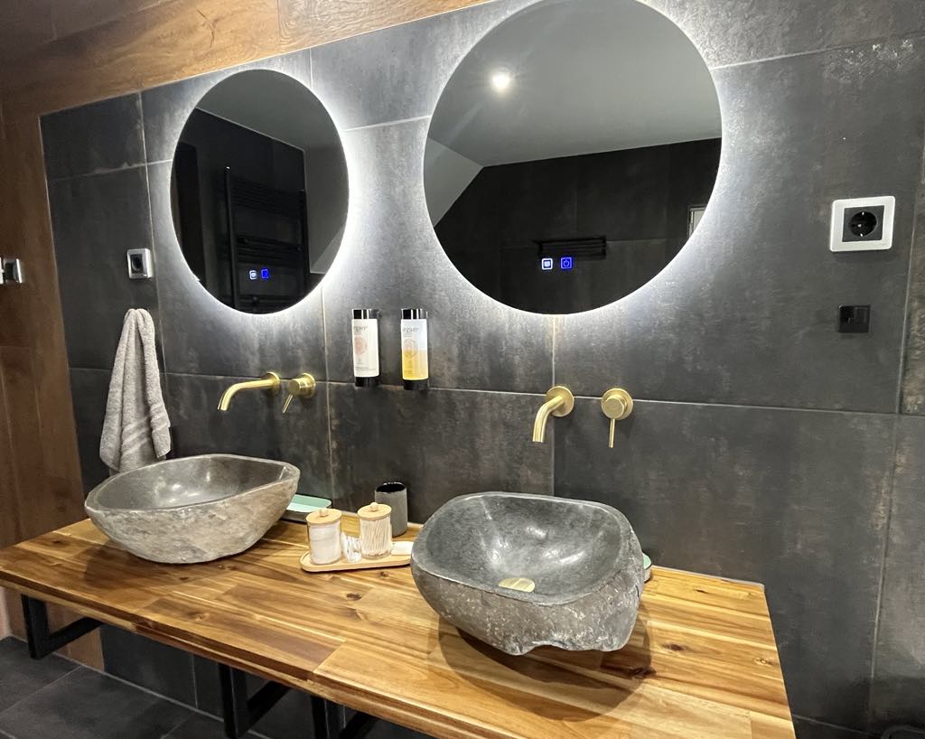 – tágas, stílusos fürdőszoba szabadon álló káddal és üvegfalas zuhannyal, padlófűtéssel