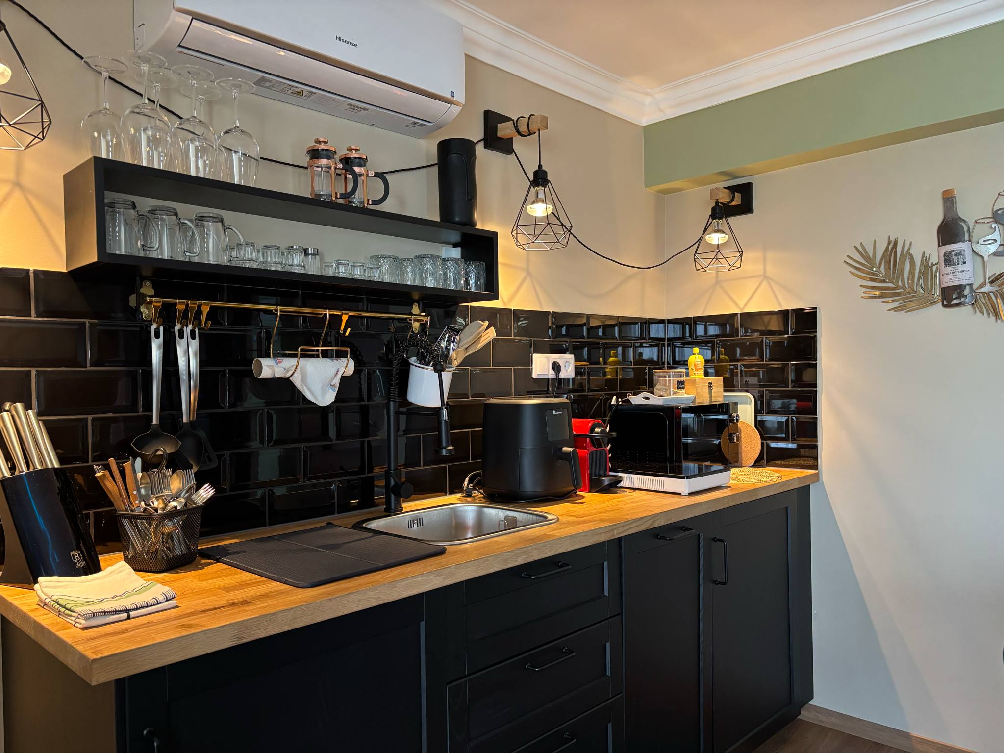 – teljesen felszerelt konyha: air fryer, mosogatógép, kávéfőző, vízforraló és minden, ami a gondtalan pihenést szolgálja