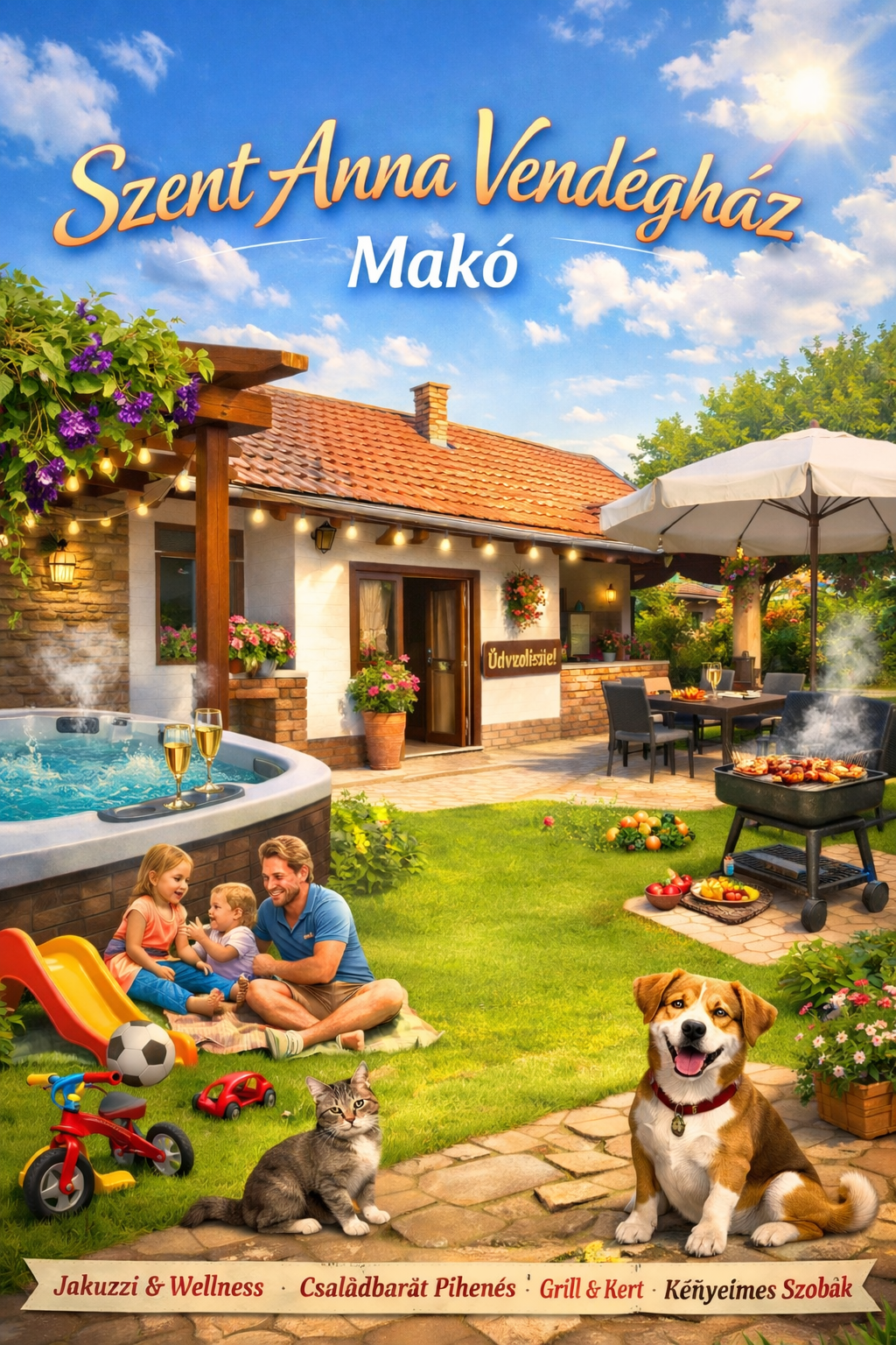 Makón, nyugodt környezetben de mégis a központhoz közel találod a Szent Anna Vendégházat, amely ideális választás pihenéshez és kiránduláshoz. A ház két szobával rendelkezik. Két egyszemélyes ágy és egy nagy franciaágy biztosít kényelmes alvást. Igény esetén baba utazóágyat is adunk. A tágas nappali amerikai konyhával és étkezővel egy légtérben van, így együtt töltheted az időt a családdal. A konyhában külön kávésarok található. A babák számára etetőszéket biztosítunk. A vendégház klímával felszerelt. Lehetőséged van grillezni és bográcsozni. A jakuzzi kényelmes kikapcsolódást nyújt. Kerékpárral könnyen bejárhatod a Maros-partot és a környéket, ehhez bicikliket biztosítunk. A kisállatok az udvarban tudnak pihenni, játszani biztonságosan. Az udvarban parkolhatsz. Ingyenes wifi is a rendelkezésedre áll. A vendégház közelében több hasznos lehetőség is van. 600 méterre Lidl található. 30 méterre étterem működik. Körülbelül 100 méterre sportpálya és játszótér érhető el. Hagymatikum fürdő, Lombkorona sétány, Maros part 1 km belül megtalálható.