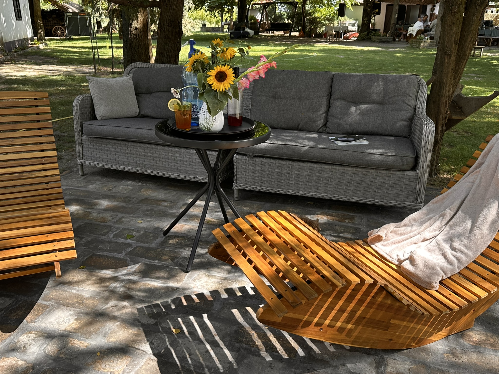 A két épület között helyezkedik el egy hydro-massage fatüzeléses dézsafürdő (8 személyes) pihenőtérrel.