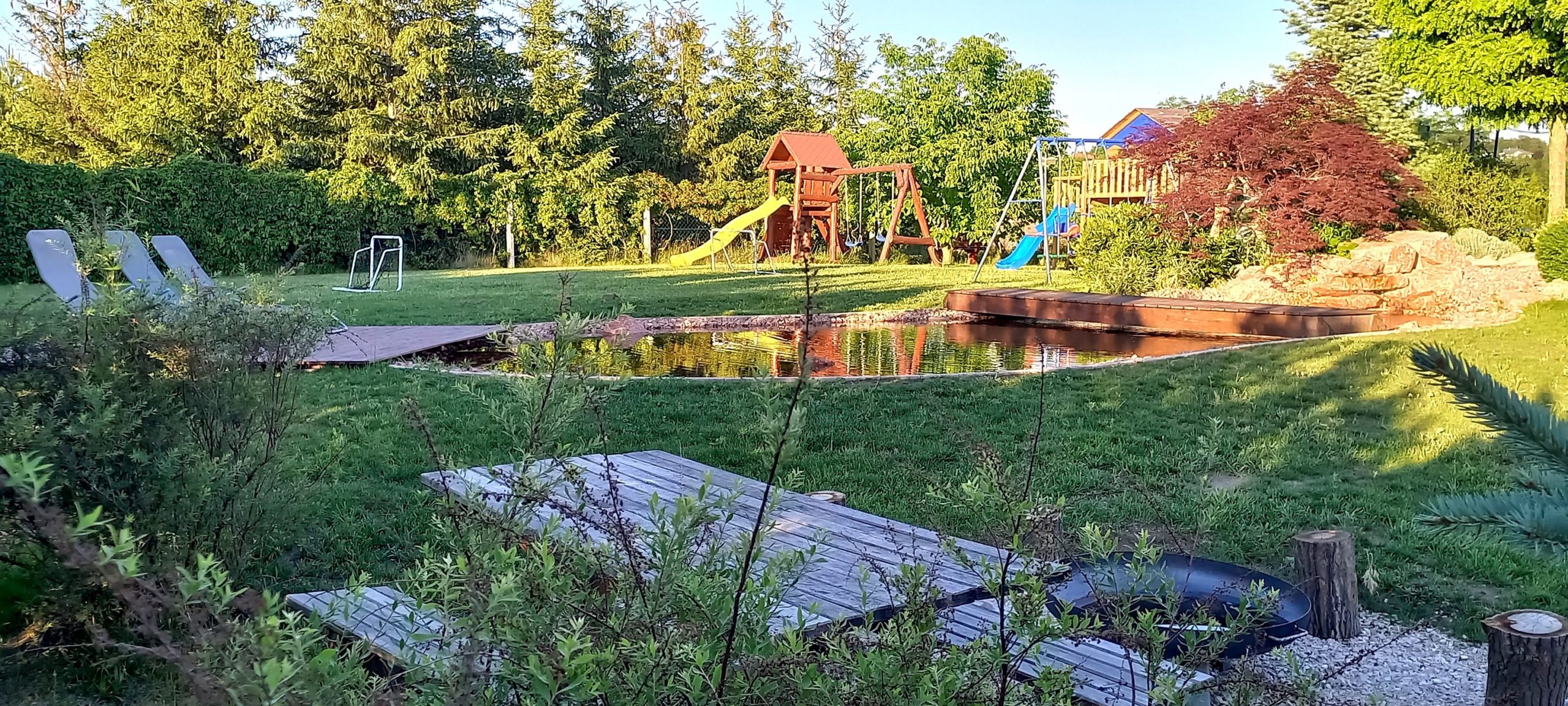 A kert pedig…. egyszerűen imádjuk. Mi, és a vendégek is. Hatalmas beszélgető-, és sokféle sütögetési lehetőséget adó grillteraszon át érkezhetsz meg ide a nappaliból, vagy a medence térből. Kerti tó kispaddal, fa játszótér homokozóval, hinta és csúszda, trambulin, kosár palánk, ….